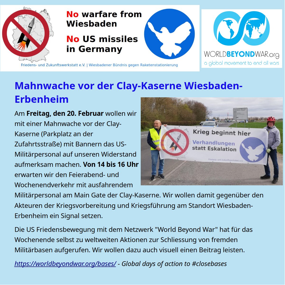 die US-Friedensbewegung mit dem Netzwerk „World Beyond War“ hat für das Wochenende selbst zu weltweiten Aktionen zur Schließung von fremden Militärbasen aufgerufen. Wir wollen dazu auch visuell einen Beitrag leisten. Deshalb laden wir kurzfristig zu einer Mahnwache am Freitag, den 20. Februar 2026 vor der Clay-Kaserne (Parkplatz an der Zufahrtsstraße) mit Bannern das US-Militärpersonal auf unseren Widerstand aufmerksam machen. Von 14 bis 16 Uhr erwarten wir den Feierabend- und Wochenendverkehr mit ausfahrendem Militärpersonal am Main Gate der Clay-Kaserne. Wir wollen damit gegenüber den Akteuren der Kriegsvorbereitung und Kriegsführung am Standort Wiesbaden-Erbenheim ein Signal setzen.